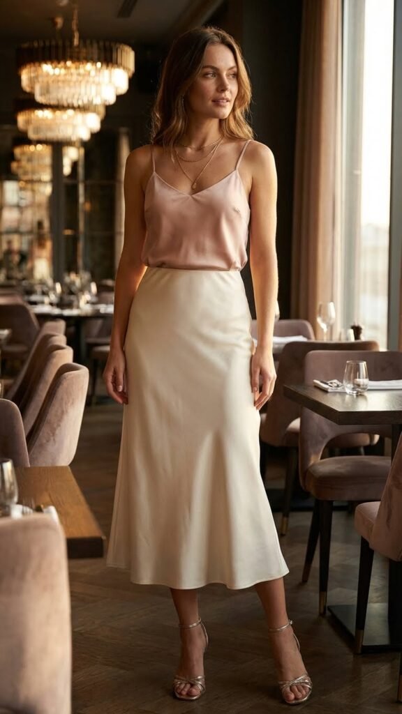 There’s something about a flowing midi skirt that just feels romantic without being over the top. Whether you go for satin, chiffon, or even a textured pleated number, pair it with a silky camisole tucked in, and you’ve got instant elegance.