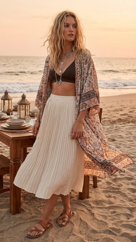This three-piece situation is perfect for beach dinners with a slightly boho vibe. Start with a flowy midi skirt in a soft fabric. Add a simple bralette or bandeau top (nothing too revealing if that’s not your style, but enough to feel summery). Then layer a lightweight kimono or cover-up over everything.