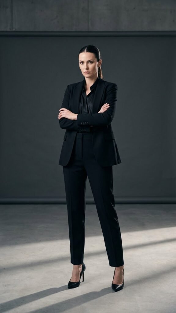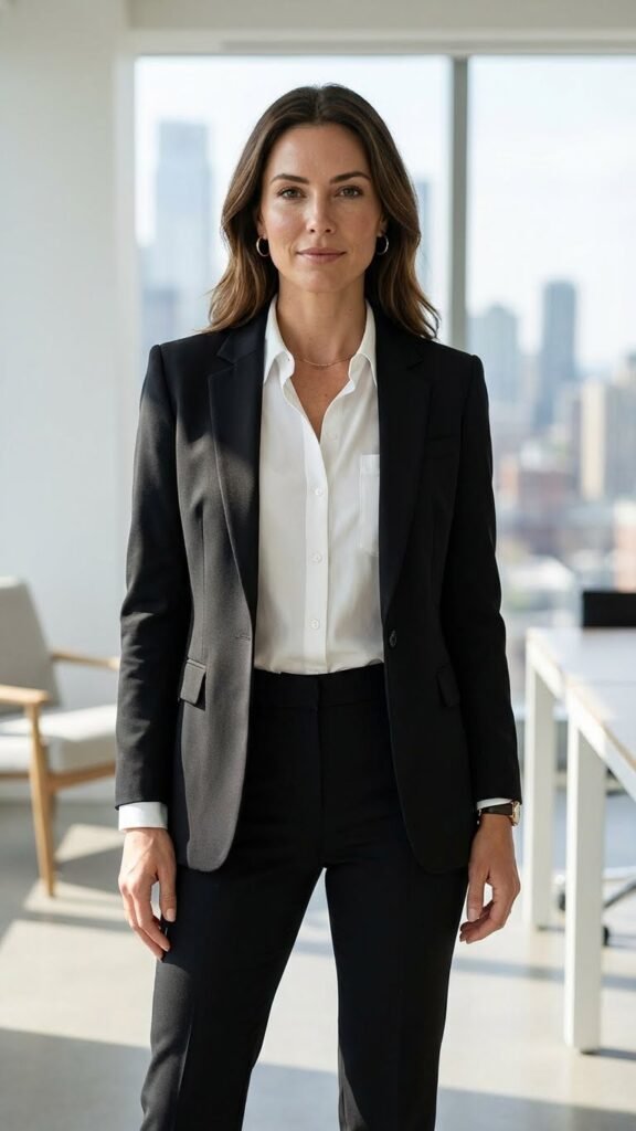 Mix textures like wool trousers with a silky blouse so it does not feel flat. People love this look because it is effortless and always reads powerful.