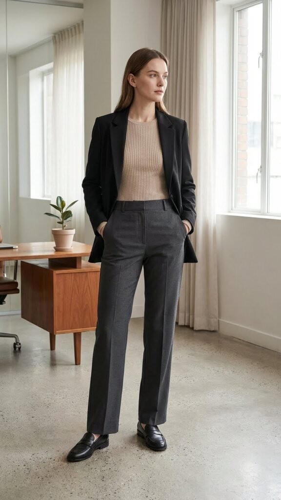 Add ankle boots or sleek flats to keep it grounded. This outfit is popular because it balances power and ease so well.