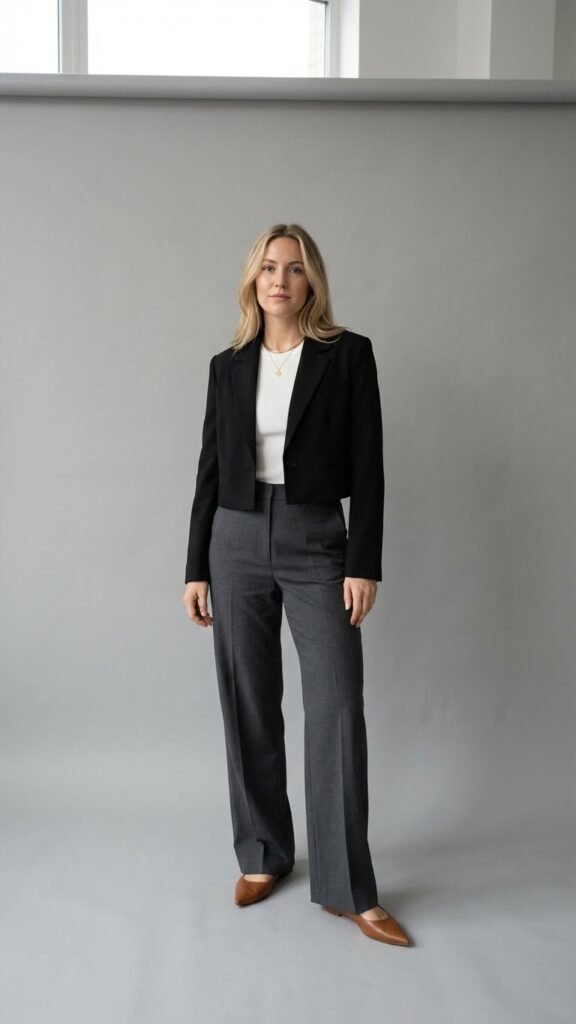Cropped blazers bring a modern edge to office outfits without crossing the line. When you pair a cropped black blazer with high waist trousers, the proportions just work.