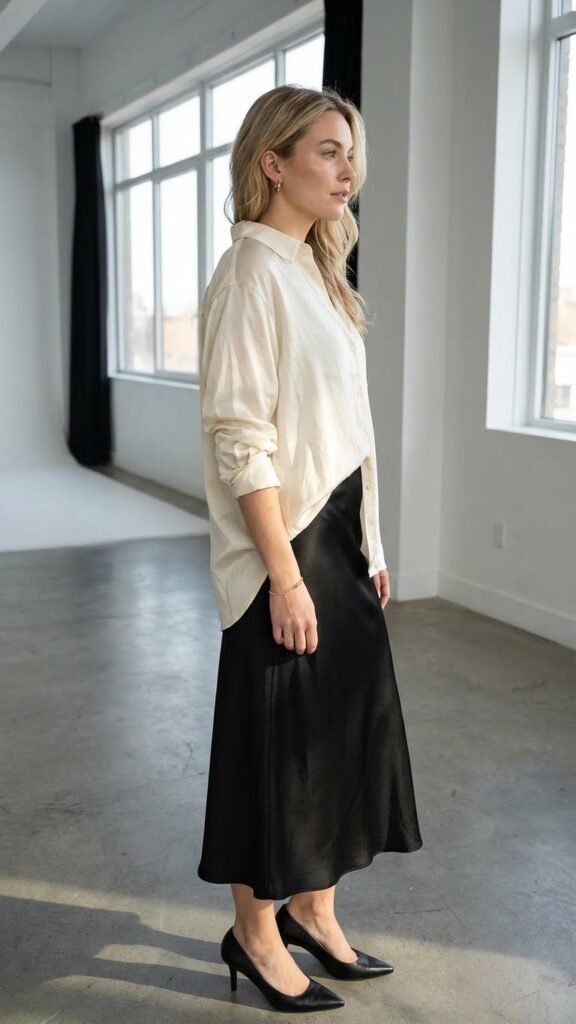 A silk or satin button down paired with your black satin skirt creates this luxe, tonal look that screams expensive taste. The all satin moment is surprisingly wearable and absolutely gorgeous.