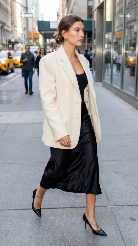 Here’s where things get interesting. Take that same satin skirt and throw an oversized blazer over it. Suddenly you’ve got this cool girl energy that says “I’m important and slightly unapproachable in the best way possible.”