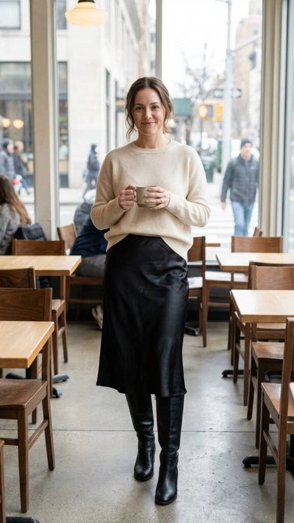 A soft, slightly cropped cashmere sweater in cream, camel, or soft gray tucked into your black satin skirt is giving elevated comfort. It’s the outfit equivalent of a warm hug that also happens to look incredible. Half tuck or full tuck both work here, but I’m partial to the effortless half tuck because it looks like you didn’t try too hard.