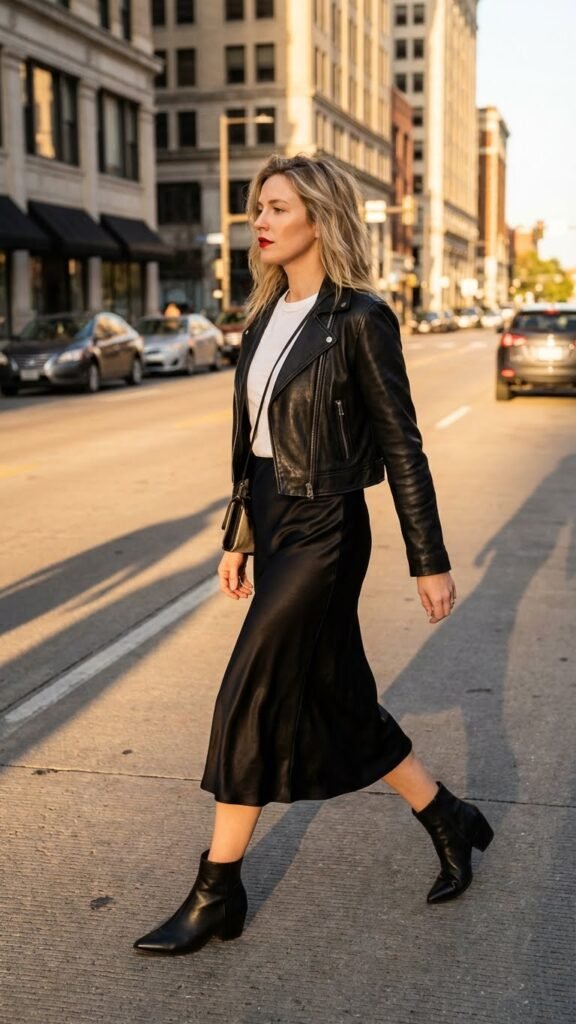 The contrast between tough leather and soft satin creates this unexpectedly cool vibe. Go for a cropped or fitted style so you don’t overwhelm the skirt. Add a simple white tee or black tank underneath for that effortlessly cool look.
