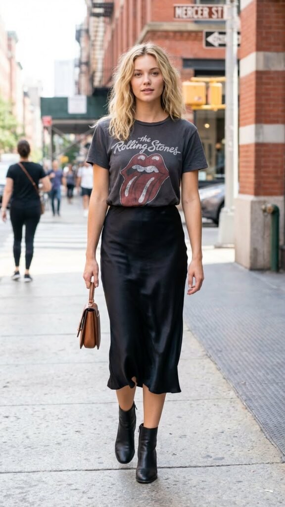 This one’s for my girls who want to look cool without looking like they tried. A vintage band tee or cool graphic tee tucked into your black satin skirt is the ultimate high low mix.