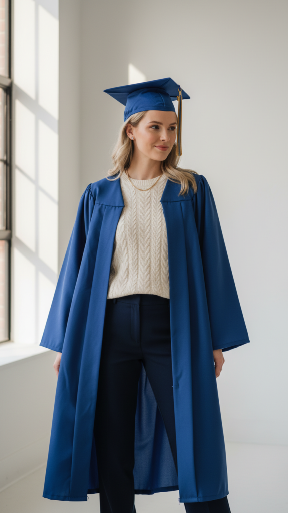 How effortlessly can you achieve timeless elegance for graduation? A cream-colored sweater paired with custom-fitted pants creates sophisticated polish beneath your blue cap and gown. The neutral cream tone complements blue beautifully while maintaining versatility for post-ceremony celebrations.