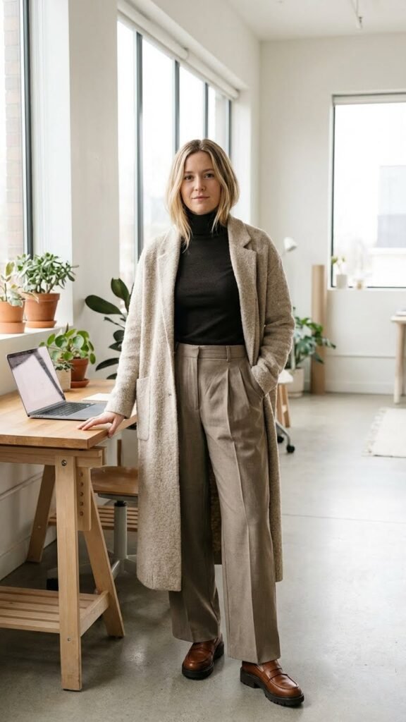 Start with a fitted turtleneck in a neutral color, add high-waisted wide-leg trousers (the kind that make that satisfying swooshing sound when you walk), and top it all off with a long cardigan coat. The cardigan coat is that perfect piece that’s warmer than a regular cardigan but more casual than a traditional coat—basically the Goldilocks of outerwear.