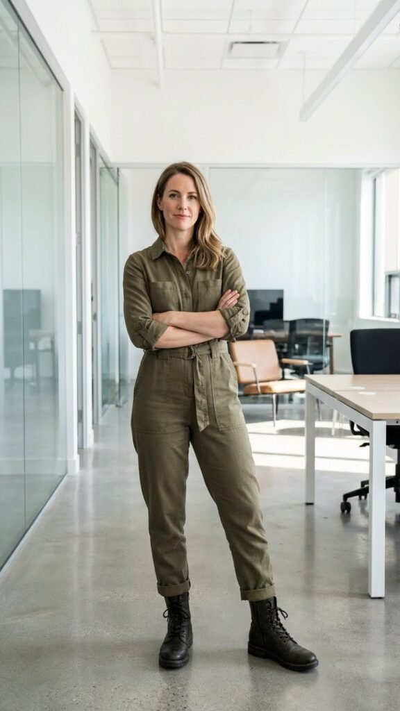 Jumpsuits can absolutely be office-appropriate, especially when you go for a utility-style jumpsuit in a neutral color and pair it with structured combat boots. This look is giving “I’m practical but make it fashion.”