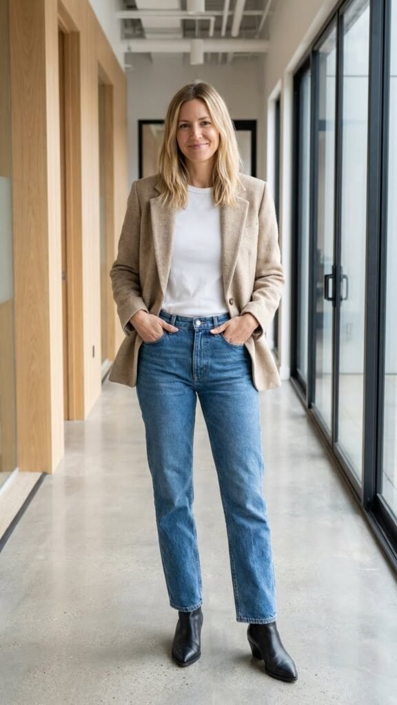 Go for a classic blazer in a neutral tone—think black, navy, or that perfect oatmeal beige. Pair it with straight-leg or mom jeans (because who has time for jeans that don’t stretch? Not me) and sleek pointed-toe ankle boots. The pointed toe is key here because it keeps things sophisticated instead of weekend-brunch vibes.