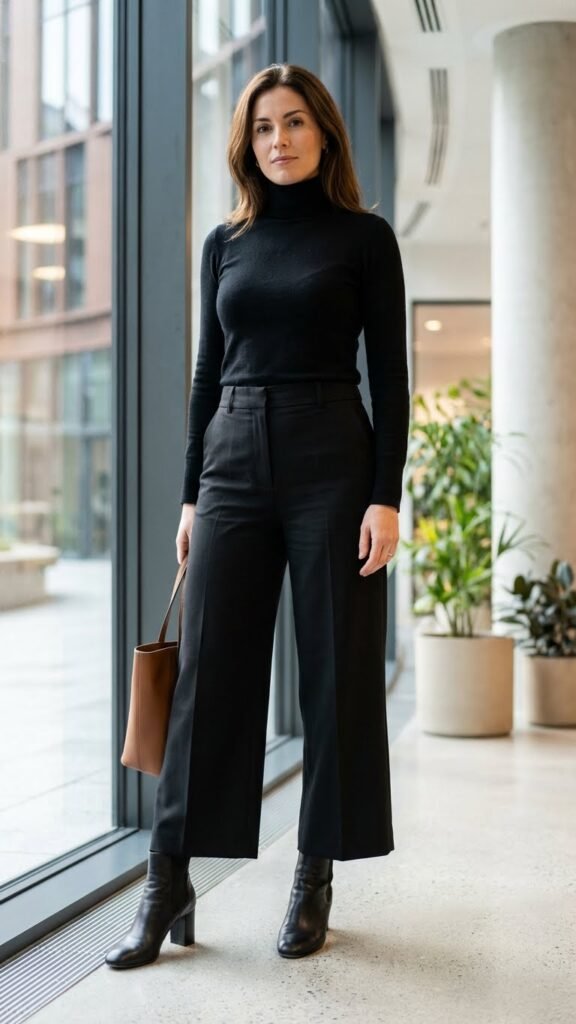 Okay, this one makes me feel like I should be strutting through a European city with a coffee in hand, but it works just as well for your Tuesday morning meeting. Fitted turtlenecks are fall’s secret weapon, and when you pair one with flowy wide-leg trousers, you get this effortlessly chic silhouette that photographs beautifully.