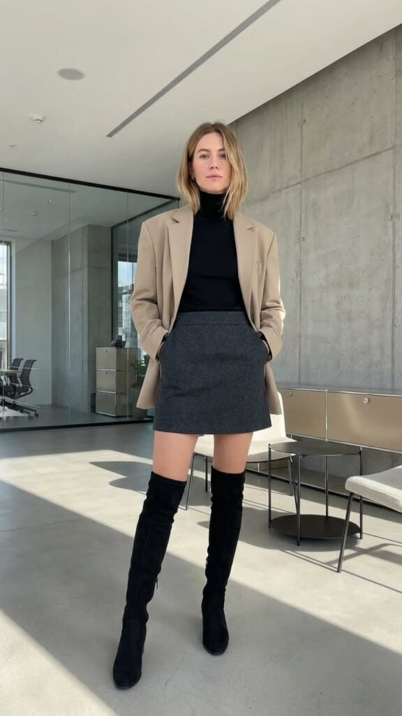 The trick is making sure the skirt isn’t too mini—go for something that hits mid-thigh, and make sure your over-the-knee boots have just a tiny bit of leg showing between the hem and the boot top. This little sliver of skin keeps the look balanced and prevents it from feeling too covered-up or costumey.