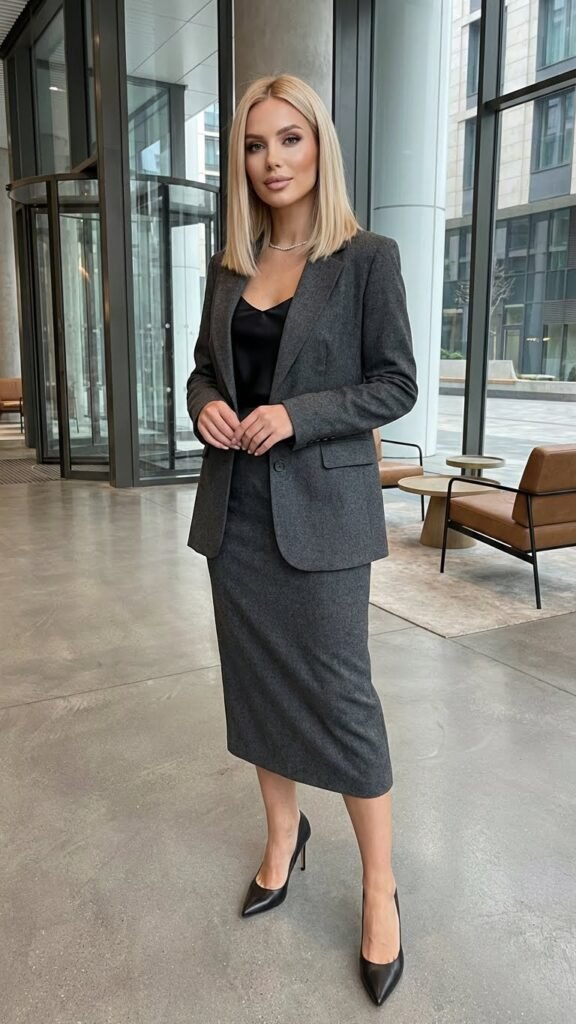 Look for matching blazer and skirt sets in contemporary cuts. Maybe the blazer is slightly oversized, or the skirt has an interesting midi length or subtle pleating. Wear a simple camisole or fitted turtleneck underneath, add sleek heels, and keep accessories minimal. This outfit shows you mean business while still looking fashion-forward. Plus, matching sets always look more expensive than they are, which is a nice bonus.