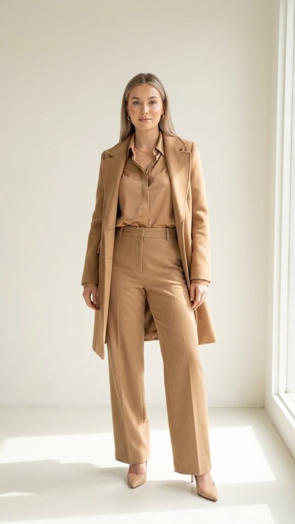 Pick your color (black, navy, cream, even burgundy), then build your outfit using different textures and tones within that same family. Silk blouse, tailored pants, and a structured coat all in variations of camel? Chef’s kiss. The key is mixing textures so you don’t look flat. Think matte trousers with a satin top, or a knit sweater with wool pants. Add your favorite heels and some delicate gold jewelry, and you’ve got an outfit that looks way more expensive than it actually is.