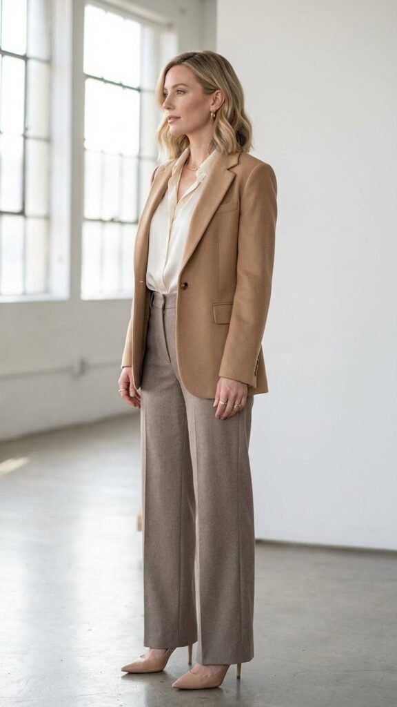 Build your outfit around neutral separates like a cream silk blouse, taupe wide-leg trousers, and a camel blazer. The beauty of neutrals is that they photograph beautifully, they’re versatile, and they create this effortlessly chic vibe. Make sure you’re playing with different textures to keep things interesting. Matte, satin, and knit all in the same color family creates depth. Add nude or metallic heels and minimal gold jewelry. This outfit whispers “quietly confident,” which is way more powerful than screaming for attention.