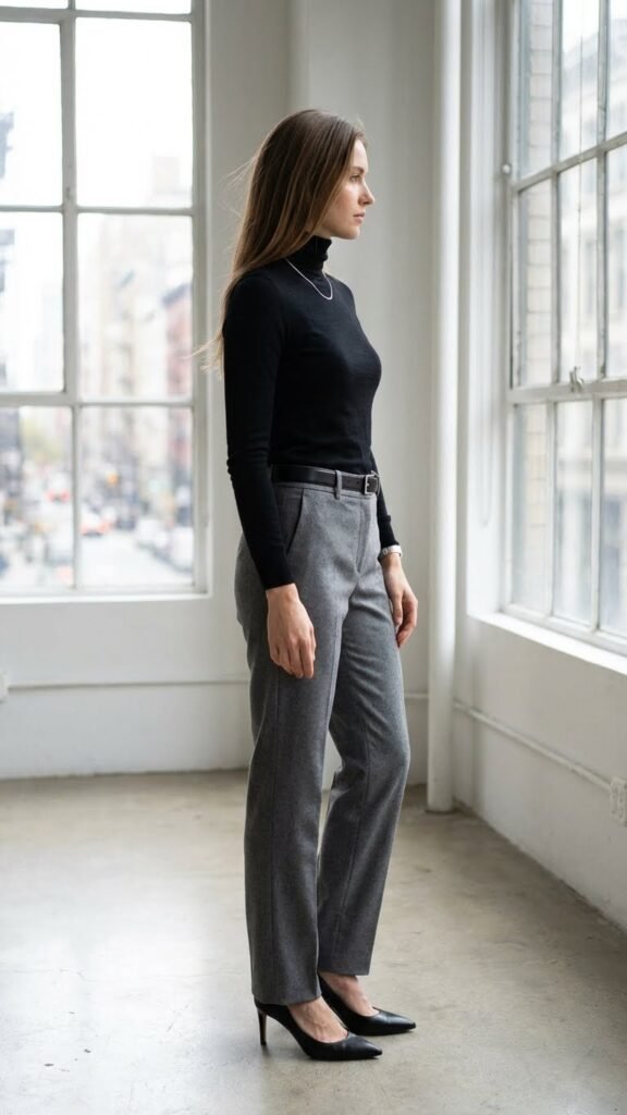 Choose a fitted turtleneck in a luxe fabric like merino wool or silk blend, nothing bulky. Pair it with tailored trousers that sit at your natural waist for that elongating effect. The monochrome version of this is particularly striking, but you can also play with color blocking if you want. Add a statement belt, pointed-toe heels, and a structured bag. It’s simple, it’s classic, and it lets your confidence be the main attraction.