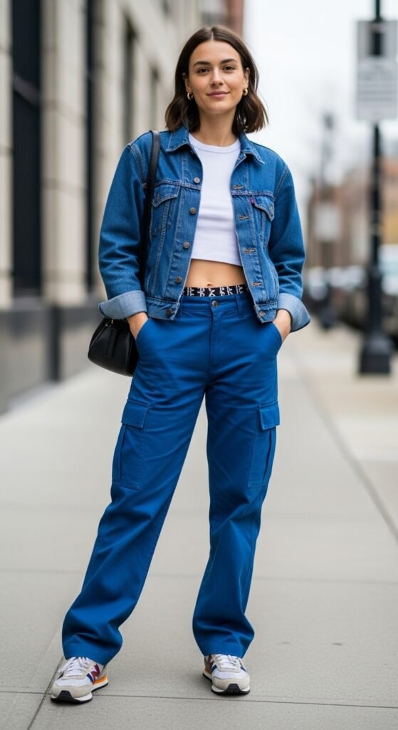Mixing casual pieces is an art form, and layering a denim jacket over cargo trousers proves it. This outfit is relaxed without being sloppy and has that cool-without-trying vibe that’s honestly hard to achieve any other way.