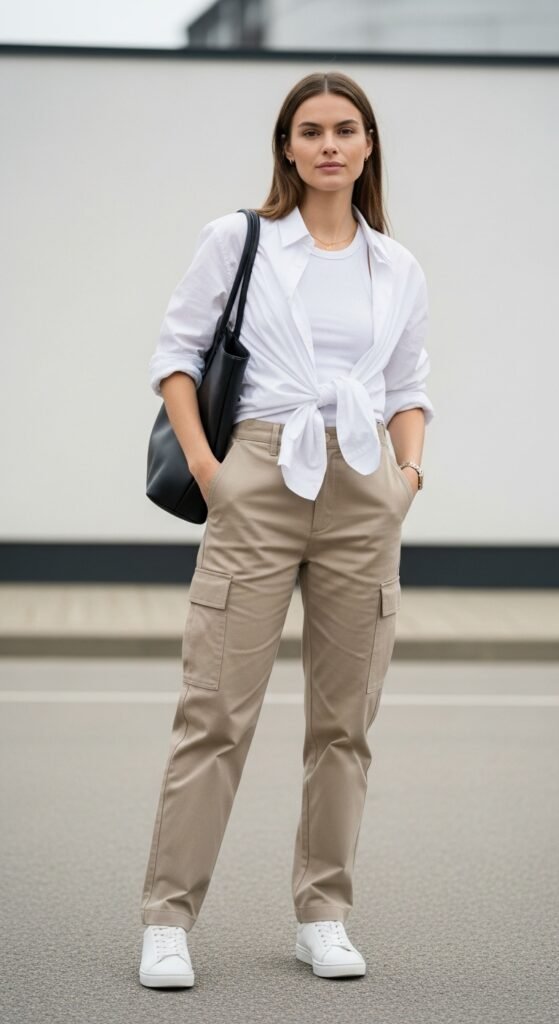 Leave a few buttons undone for a laid-back feel, or layer over a fitted tank for dimension. Loafers or clean white sneakers seal the deal. This is one of those versatile cargo trousers outfit ideas you’ll find yourself reaching for constantly.