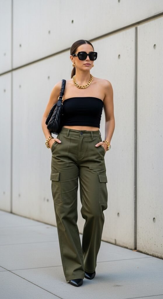 Sometimes less is more with your clothes so your accessories can do the heavy lifting. A simple tube top in a solid color paired with cargo trousers becomes a blank canvas for statement jewelry, bold bags, and eye-catching sunglasses.