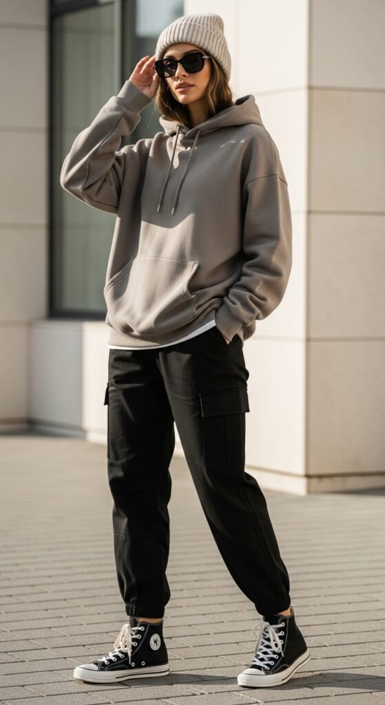 Sometimes you just want to be comfortable while still looking like you have your life together. Enter: the hoodie and cargo trousers combo. This is the outfit equivalent of a warm hug that also happens to photograph really well.