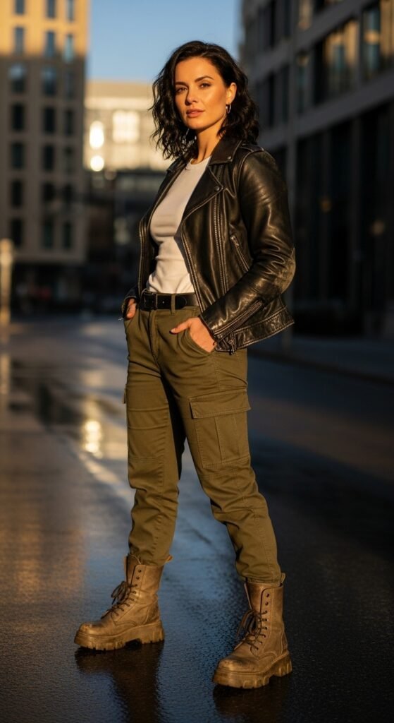 If 90s nostalgia had a favorite child, it would be this outfit. A fitted baby tee tucked into your cargo trousers creates that throwback aesthetic that’s dominating street style right now. Add platform boots for height and attitude.