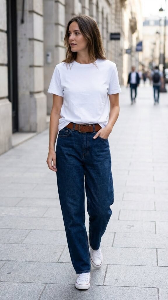 The trick here is all about proportions. Tuck that tee in loosely at the front, let it billow a bit at the back. Add a chunky belt if you’re feeling fancy, or keep it simple if minimalism is more your vibe. Throw on white sneakers or chunky loafers, and you’ve got yourself a look that says “I didn’t try too hard” while absolutely trying just the right amount.