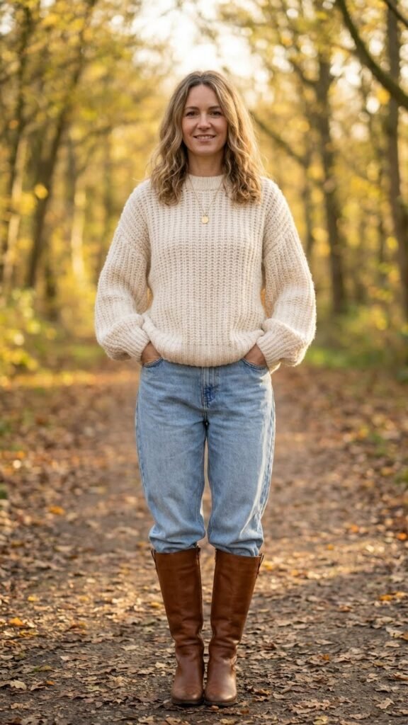 Choose a sweater that’s chunky, oversized, and begging to be lived in. Neutrals are safe, but don’t be afraid of color here. A burnt orange or forest green can absolutely transform this outfit from basic to statement-making.