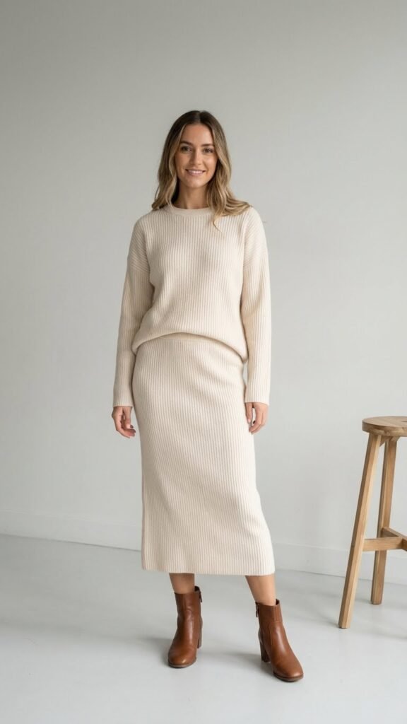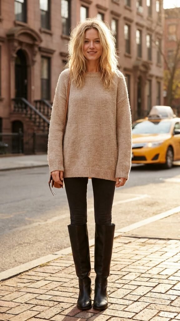 This combo is basically a cheat code for looking stylish with minimal effort. There’s something about the proportion play between a chunky knit up top and sleek boots below that just hits different. Grab your coziest oversized sweater, the one that feels like a blanket, and pair it with fitted knee-high boots. The boots add instant polish while keeping you warm if the restaurant has aggressive air conditioning. Throw on a simple gold necklace and you’ve got a look that says “I definitely didn’t spend 45 minutes getting ready” even if you did. Peak cozy meets peak chic ✨