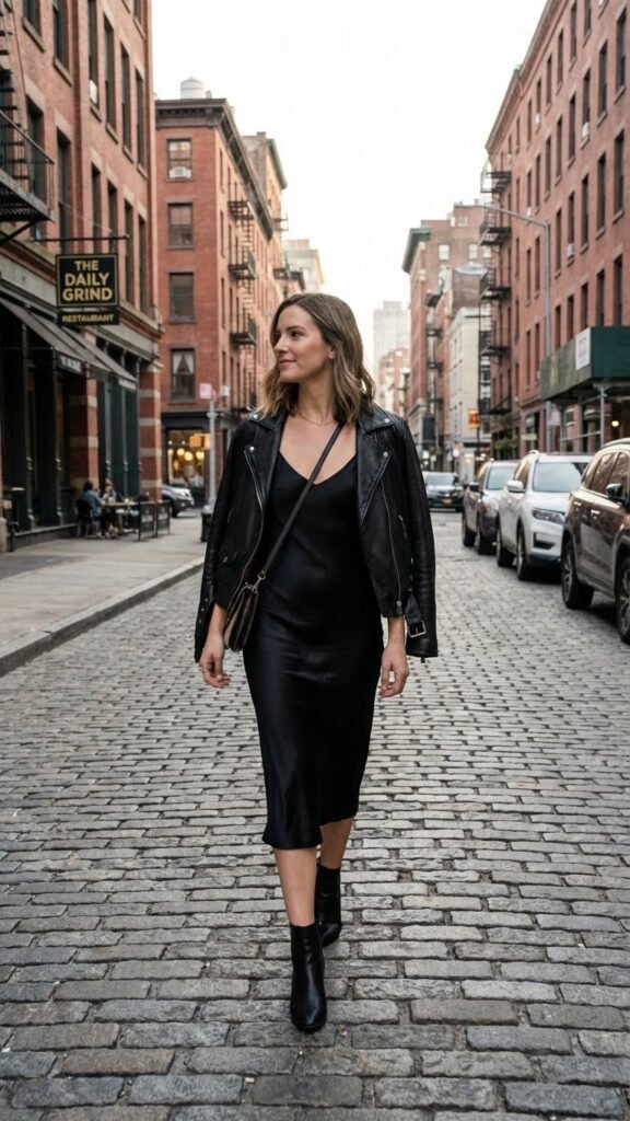 Listen, the slip dress is having a major moment and honestly? It deserves it. This silky number dressed down with a leather jacket is the dinner outfit equivalent of not trying too hard but still looking incredible. The contrast between feminine and edgy creates this effortlessly cool vibe that works at literally any restaurant. Layer a fitted tee underneath if the vibe is more casual, or go bare if you’re feeling a bit more date-night-y. I personally love adding chunky boots instead of heels here because who wants to hobble around after dinner? Not me.