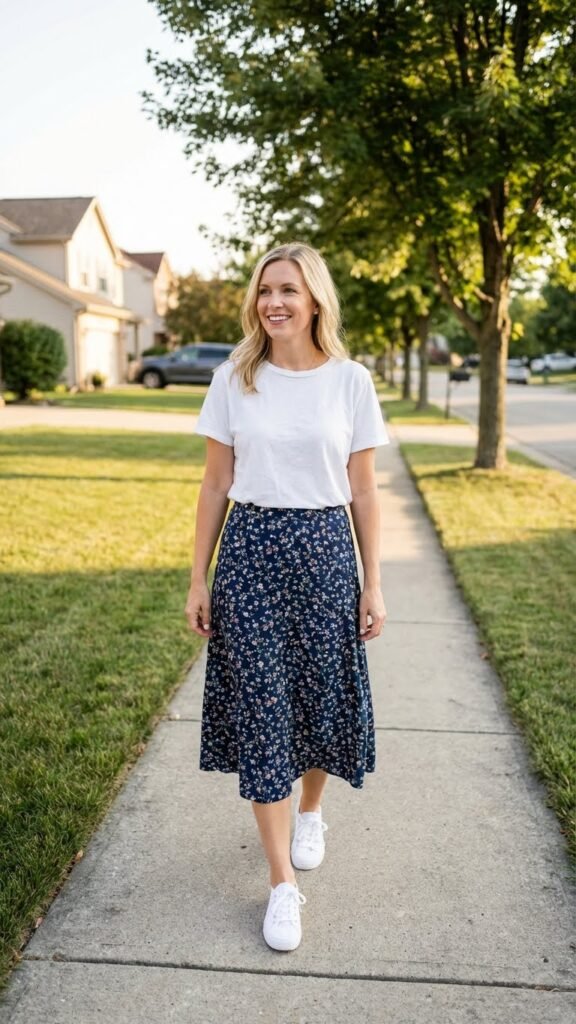Here’s where things get fun. A flowy midi skirt with clean white sneakers is giving main character energy but make it comfortable. This outfit works because it’s unexpected. People see the pretty skirt and assume heels, then boom, you show up in sneakers looking cooler than everyone else. A simple tee tucked into the skirt keeps things casual, or throw on a cropped cardigan if you want to layer. This is genuinely one of my go-to dinner looks because it photographs well, feels great, and requires about three minutes of actual effort.