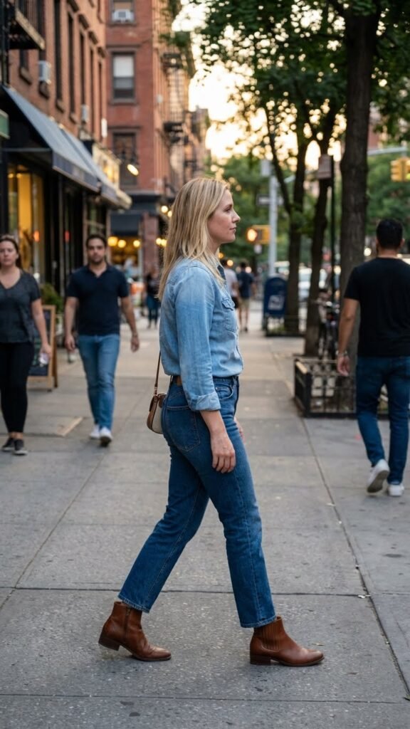 The Canadian tuxedo is back and honestly, we should all be grateful. Denim on denim works for casual dinners when you play with different washes or textures. A lighter chambray shirt with darker jeans, or a structured denim jacket over a softer denim skirt, keeps things visually interesting. The secret is making sure the shades aren’t too similar so you don’t look like you accidentally grabbed a jumpsuit. Add non-denim accessories, think leather bag, gold hoops, suede booties, and you’ve got a look that’s purposeful rather than accidental.