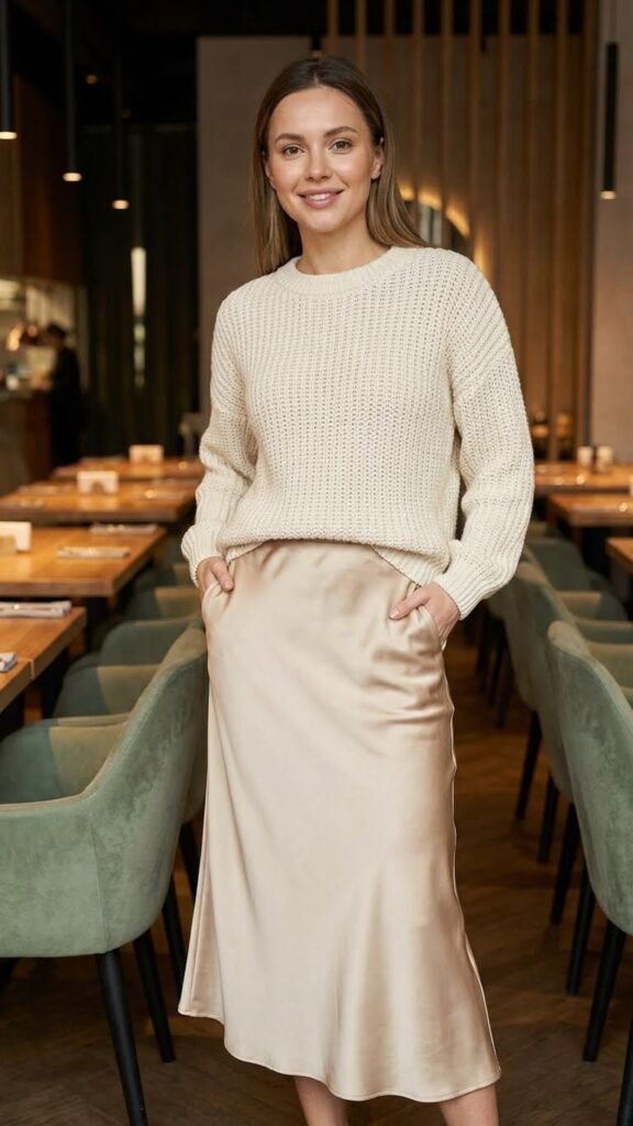 This combo is basically the dinner outfit version of having your cake and eating it too. You get the elegance of a satin skirt with the “I’m relaxed, I promise” energy of a chunky sweater tucked in at the front.