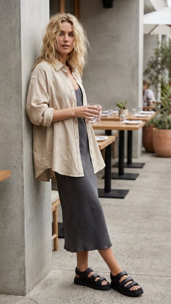 The trick here is keeping the proportions balanced. A midi-length slip skirt works best because it’s sophisticated without feeling formal. Pair it with a slightly oversized knit in a neutral tone like cream, camel, or soft grey. Add pointed-toe mules or simple heeled sandals, and you’ve got something that looks incredibly intentional.