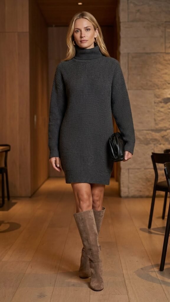 Choose a ribbed knit dress that hits mid-calf or just above the knee. The key is fit. You want it to skim your body rather than cling desperately or hang like a sack. Add knee-high boots if it’s cooler out, or pointed-toe ankle boots for something sleeker.