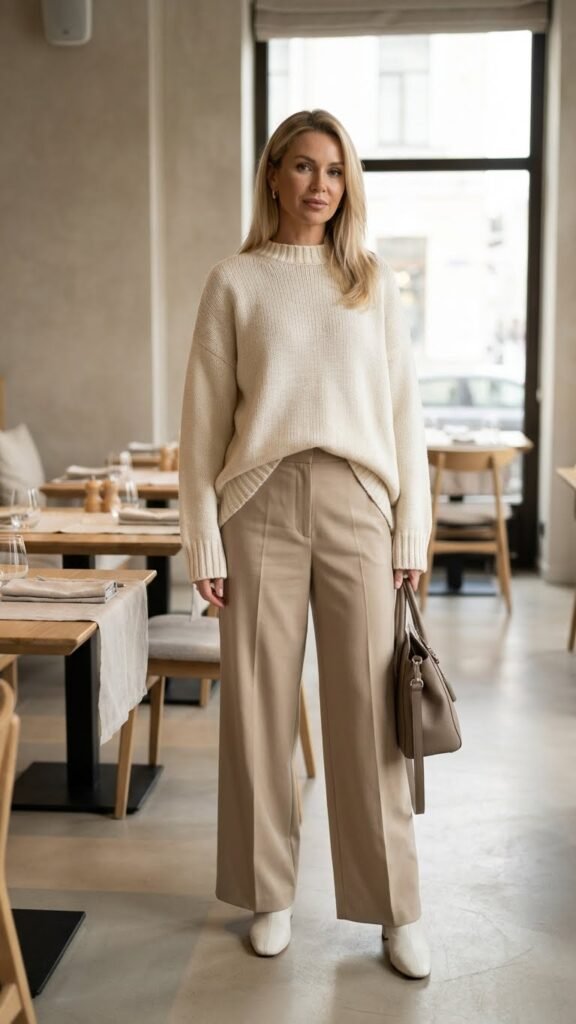 Mix textures within the same color family to add dimension. A cashmere top with wool trousers and suede boots in the same shade makes this look intentional rather than accidental. Add gold jewelry and you’re genuinely done.