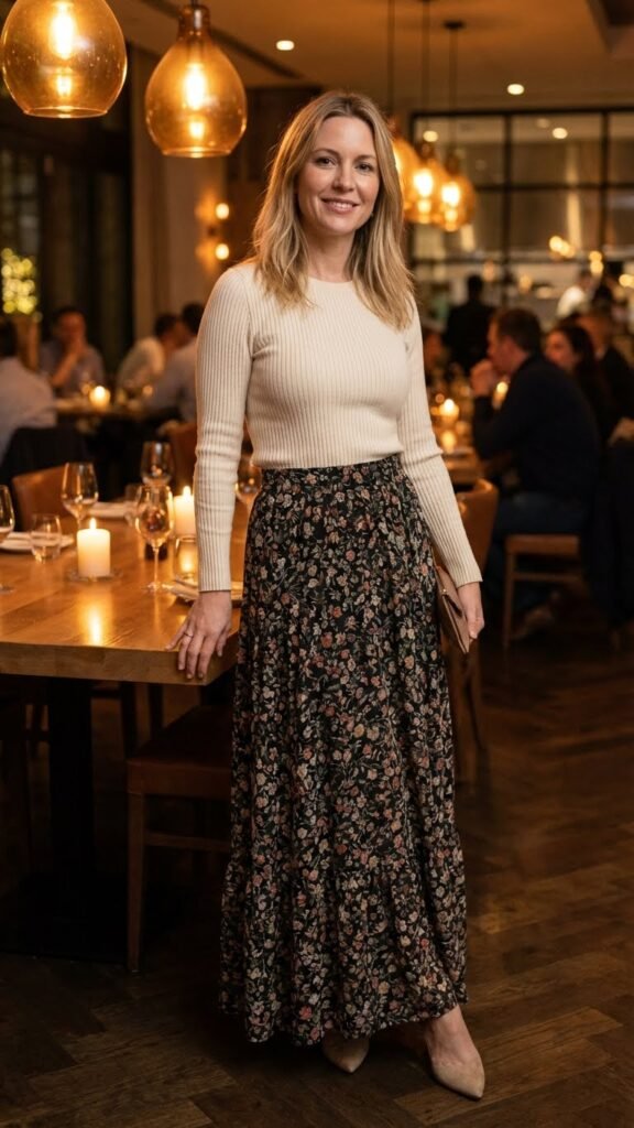 Maxi skirts are having a serious moment, and dinner is their perfect stage. A flowy maxi skirt in a solid color or subtle print paired with a fitted knit top creates that effortless romantic vibe that never goes wrong.