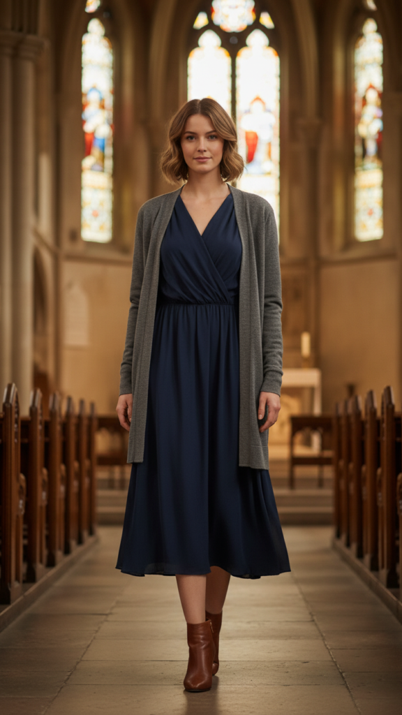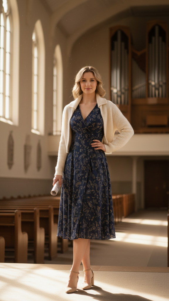 When you’re searching for the perfect church concert outfit, a classic midi dress paired with a cardigan delivers timeless elegance and appropriate coverage.