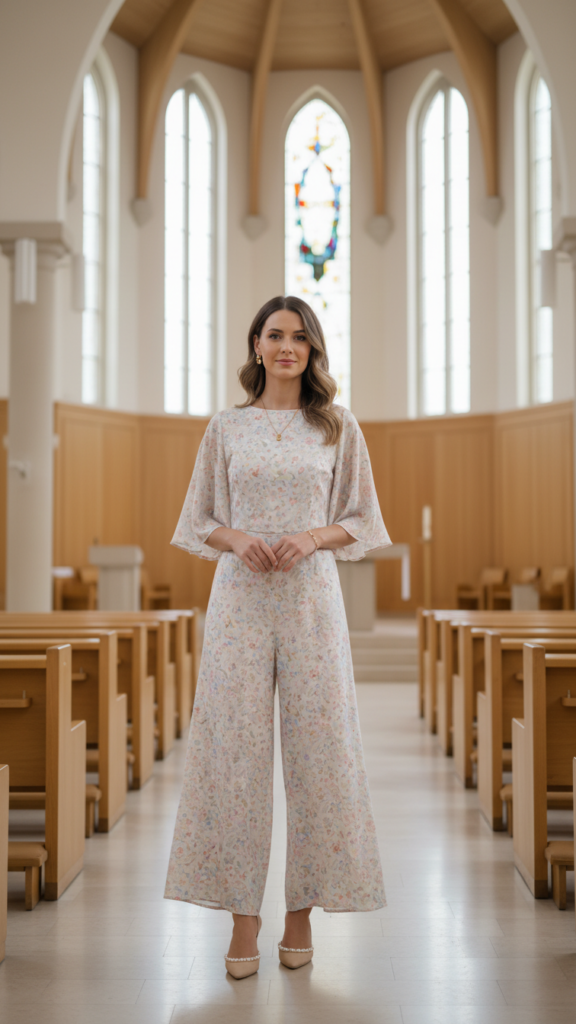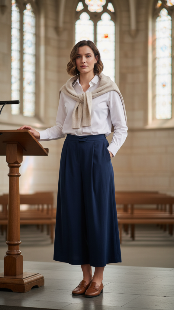 Why settle for traditional dresses when culottes paired with a button-down shirt create such a sophisticated yet comfortable ensemble for church concerts? This versatile combination offers freedom of movement while maintaining modest coverage that’s perfect for worship settings.