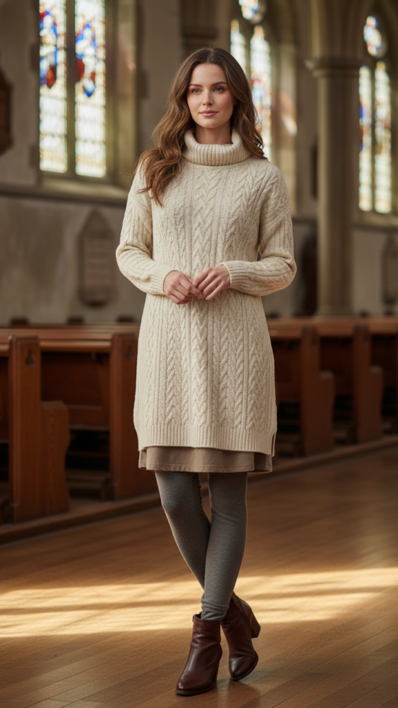How effortlessly can you achieve both warmth and modesty for church concerts? Sweater dresses with leggings create the perfect balance of comfort and coverage.