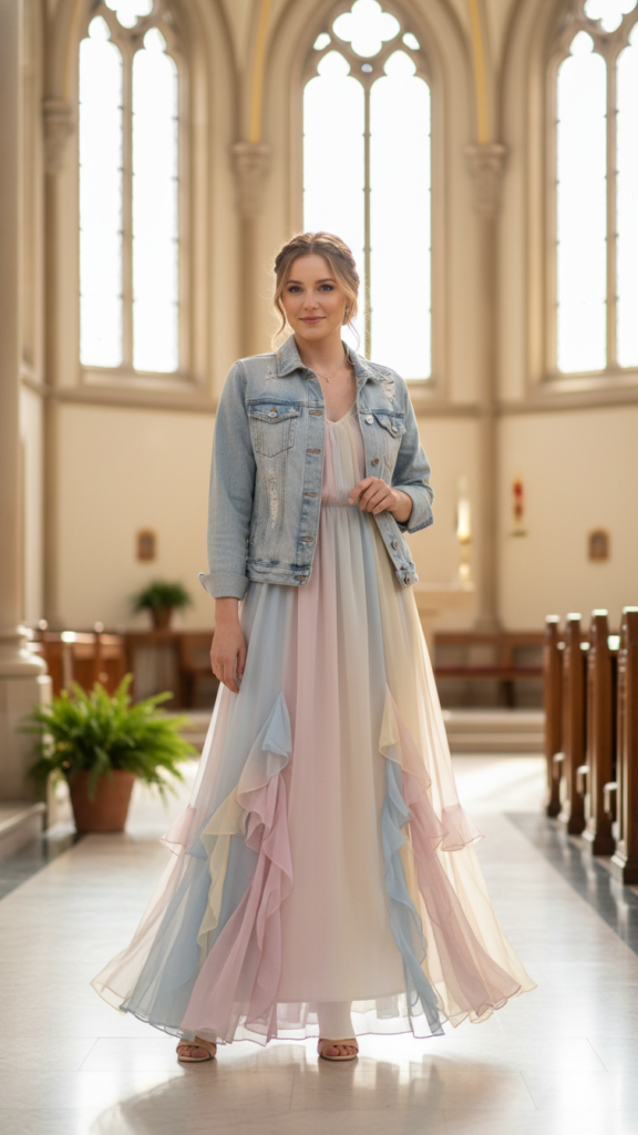 Choose a ruffled maxi dress in solid colors or subtle patterns that won’t distract during performances. Layer a classic denim jacket or lightweight button down over your dress for added modesty and warmth. This versatile pairing works beautifully for both indoor and outdoor church concerts, giving you the freedom to worship comfortably while looking effortlessly put-together. The light and airy fabric choices help you stay cool during summer services while maintaining the modest appearance appropriate for worship.