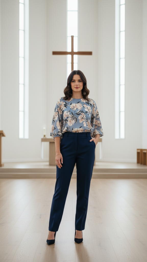 Choose high waisted denim in dark washes for a polished appearance that maintains comfort throughout extended services. Pair your trousers with a floral print blouse featuring modest necklines and three-quarter sleeves for balanced coverage. Tuck the blouse partially or completely to emphasize your waistline while creating clean lines.