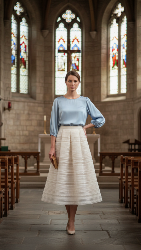Choose midi-length skirts with lace accents along the hemline for added sophistication, or opt for pleated detailing that creates graceful movement. Pair your skirt with a fitted blouse tucked neatly at the waist to define your figure. Consider fabrics like cotton blends or lightweight wool that won’t wrinkle during extended sitting periods while maintaining a polished appearance throughout the evening. This combination creates a fashionable plus-size look that maintains the modest appearance appropriate for church settings.