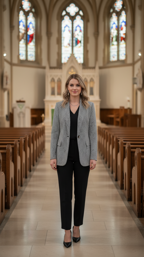 Nothing quite matches the polished professionalism of a blazer and dress pants ensemble for church concerts where you want to strike the perfect balance between formal and approachable. You’ll create instant sophistication while maintaining comfort throughout the service.