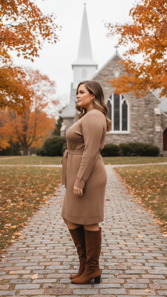 When temperatures drop and you’re searching for church attire that balances warmth with worship-appropriate style, textured sweater dresses paired with knee-high boots deliver the perfect solution. Choose cable-knit or ribbed designs that create visual interest while maintaining modesty—avoid styles with plunging necklines for appropriate coverage.