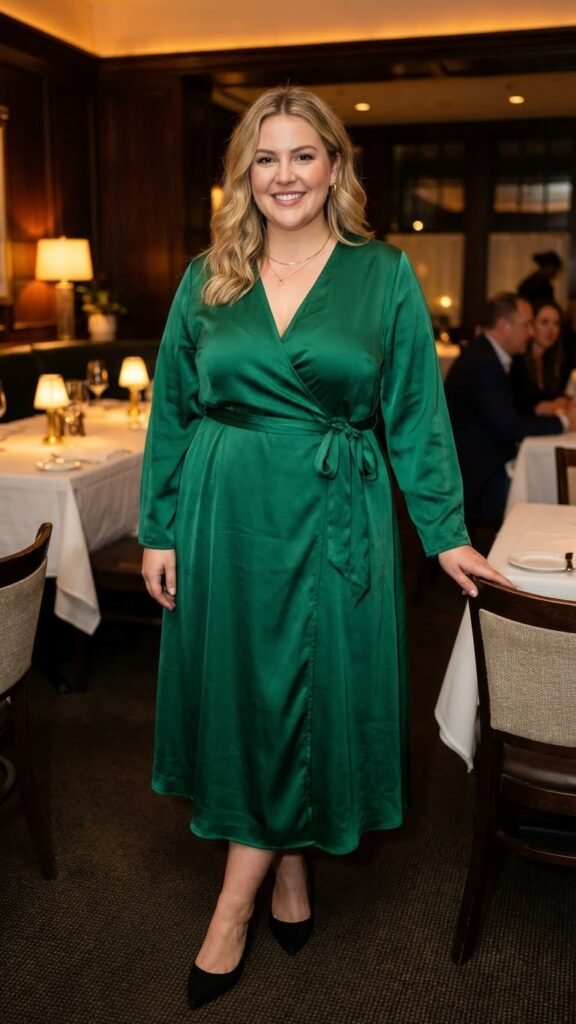 For dinner, choose a wrap dress in a rich jewel tone like emerald or burgundy. Pair it with pointed-toe heels to keep the line long and elegant. Add delicate gold jewelry and you’re basically red carpet ready. The beauty here is versatility. Dress it down with cute flats for casual spots or go full glam with statement earrings for upscale venues.