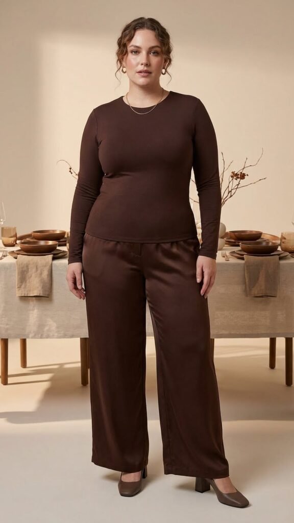 For dinner, try all-black if you’re going classic or experiment with rich tones like chocolate brown or deep plum. Mix textures within your chosen shade to keep things interesting. A matte top with silky pants in the same color family looks intentional and elevated. Add metallic accessories as your pop of contrast. This look screams “I have taste” without trying too hard.