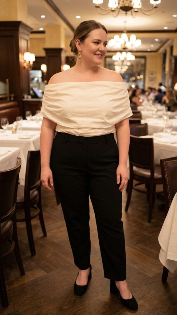 This look works whether you prefer dressy trousers or structured jeans for more casual dinner spots. The key is ensuring your pants sit at your natural waist for maximum flattery. Add dangly earrings that complement the exposed shoulder area. A subtle heel elongates the look without being uncomfortable for long dinners.