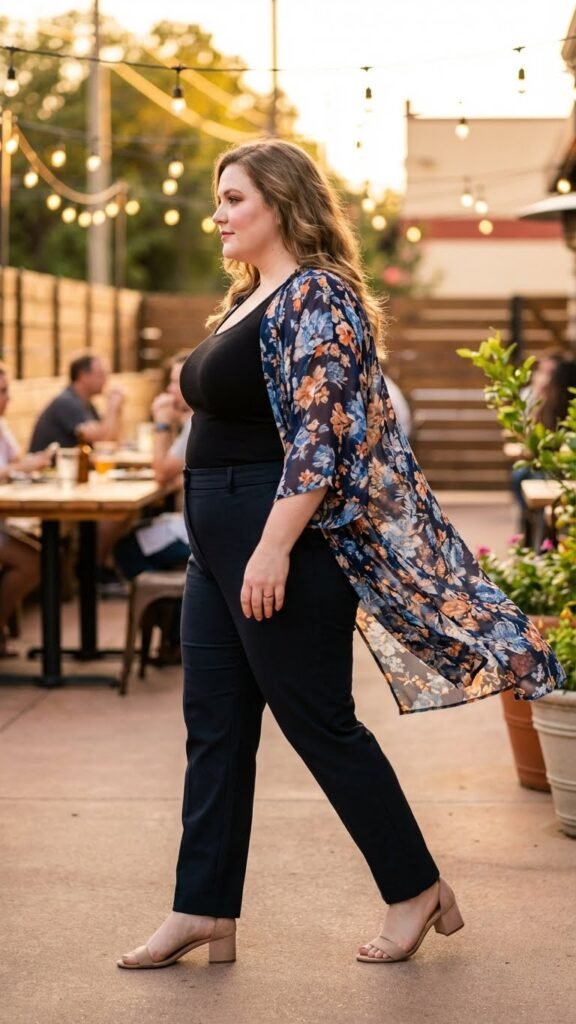 Start with a simple base like black pants and a fitted top. Then throw on a printed or textured kimono that does all the heavy lifting aesthetically. This approach is fantastic when you want to feel dressed up but don’t want to think too hard. The kimono becomes your statement piece. Keep jewelry minimal since the jacket provides enough visual interest. Perfect for outdoor patios or restaurant lounges.