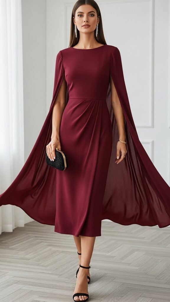 Want to make an entrance without saying a word? A cape dress or a dress with cape-like details creates movement and drama that turns heads. When you walk into a room with fabric flowing behind you, people notice.