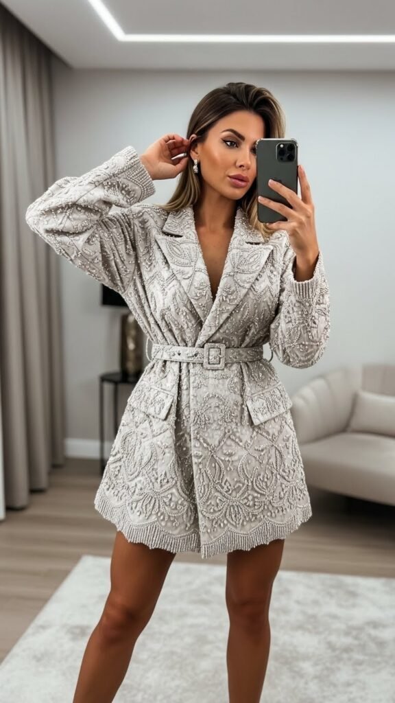 Here’s a styling hack that feels both clever and glamorous: treat an oversized embellished blazer as a mini dress. Find one with sequins, beading, or interesting embroidery, belt it at the waist, add bare legs and heels, and suddenly you have a cocktail outfit that’s equal parts fashion-forward and effortless.